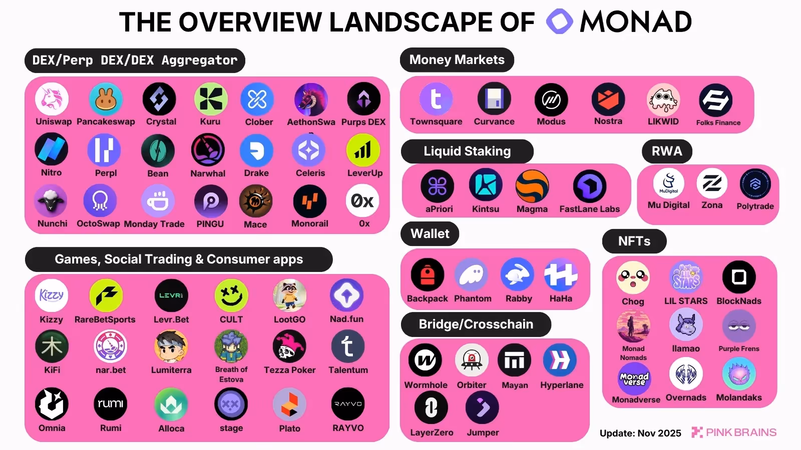 Liquid staking through aPriori, Kintsu, and MagmaDAO. Spot DEXs like Kuru, Clober, and Crystal. Perpetual DEXs including Drake, Celeris, and Narwhal Finance. Lending through Townsquare and Curvance. DEX aggregators like Monorail. Prediction markets from Kizzy, Levr.Bet, and RareBetSports. AI and agentic tools from Symphony and TypeX. Plus gaming, NFTs, and early RWA tokenization plays.